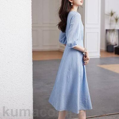 ワンピース ドレス 袖あり エレガント レディース きれいめ カジュアル おしゃれ 五分袖 大人 可愛い フェミニン ミモレ丈 ナチュラル Vネック ゆったり 体型カバー ハイウエスト ブルー | HUG-L