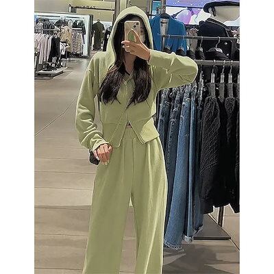 【 迅速な出荷 】韓版 無地 長袖 セットアップ トップス+ズボン 上下2点セット ワイドパンツ パーカー アウター 秋冬 体型カバー 着痩せ 大きいサイズ 上下セット