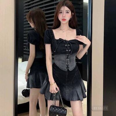 レースアップ グラデーション デニム ブラウス プリーツ ミニ スカート 2点セット トップス スクエアネック オフショルダー ショート ボトムス 半袖 ガーリー フェミニン カジュアル 肌見せ 上下 | HUG-L