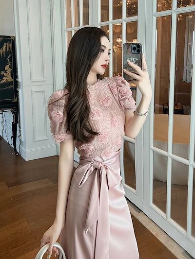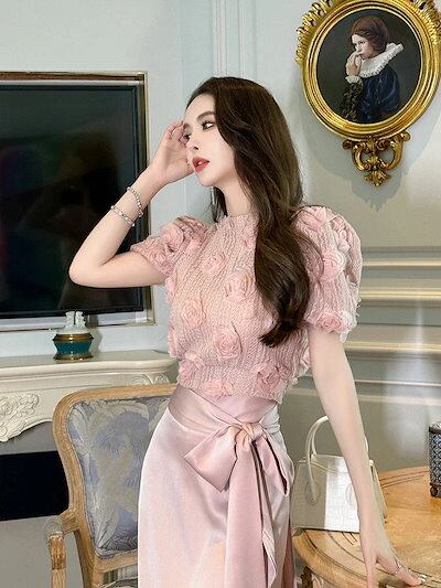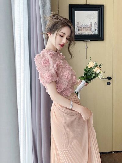 人気なリブニット 半袖 ニット花飾り 秋冬夏 薔薇 フリル ショート丈 セーター レディース トップス ドレス パーティー キャバ 着痩せ 大人 お呼ばれ 同窓会 披露宴 卒業式 結婚 | HUG-L