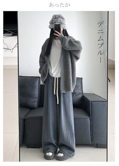 ストレートパンツ ワイドパンツ レディース カラバリ裏起毛 ストライプ ウェストゴム 体型カバー パンツ ボトムス ゆったり イージーパンツ フレアパンツ ハイウェスト もこもこ ロング ロングパンツ | HUG-L
