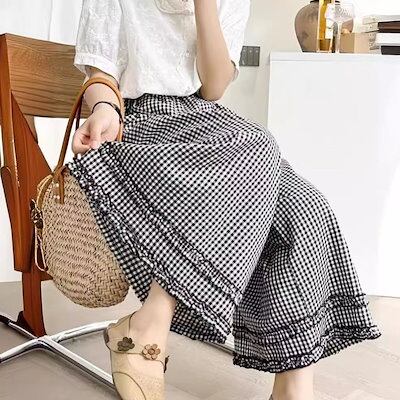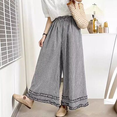 ワイドパンツ チェック レディース 夏 秋 九分丈 ギンガムチェックワイドパンツ パンツ ボトムス フレアパンツ レース チェックパンツ 大きいサイズ ポケット付き ウエストゴム イージーパンツ 綿 | HUG-L