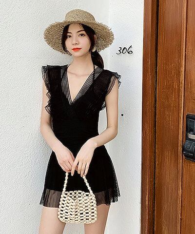 水着レディースワンピースオールインワンフリルレースシアーフレアワンピース水着大きいサイズ体型カバーホルターネックセクシーショートパンツスカートリゾート上品可愛い夏韓国風韓国ファッション | HUG-L