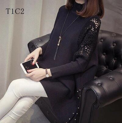 ニット セーター 長袖 ロング丈 ドルマンスリーブ レディース ハイネック 透かし彫り アウター サイドスリット お洒落 ゆったり デザイン 秋冬 コーデ 通勤
