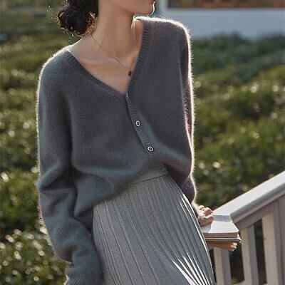 フレンチセーターカーディガンガーリーレッドvネック秋のけだるい風アウターゆったりモチモチニットコートトップス
