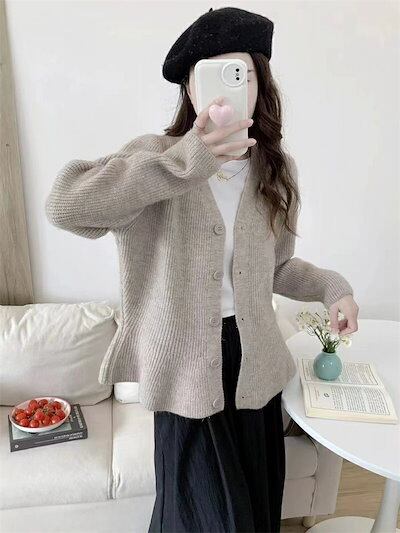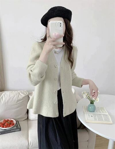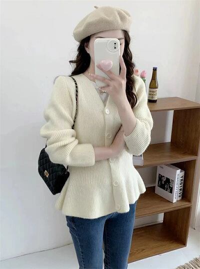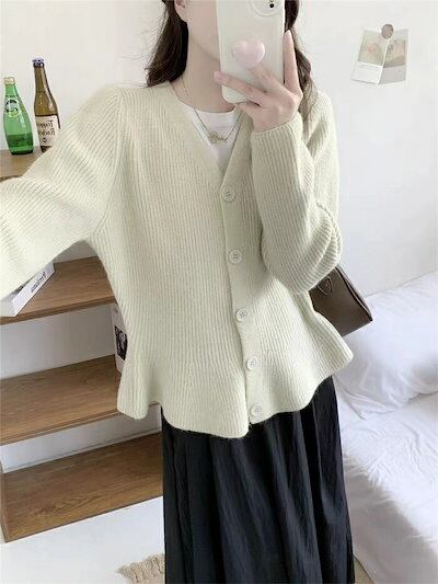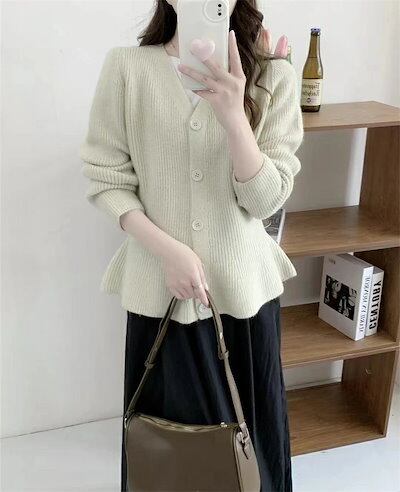 カーディガン ニット レディース Vネック アウター スカラップ 無地 セーター ニットカーディガン コーディガン 長袖 フレア裾 ニットトップス ショート丈 ニットソー 切替セーター 春秋 無地 デ