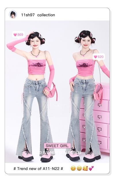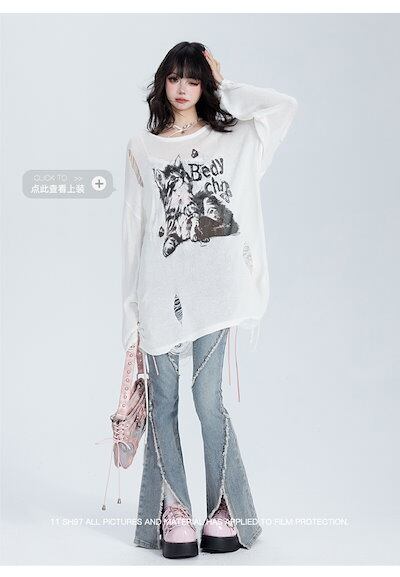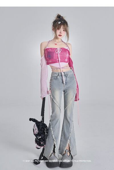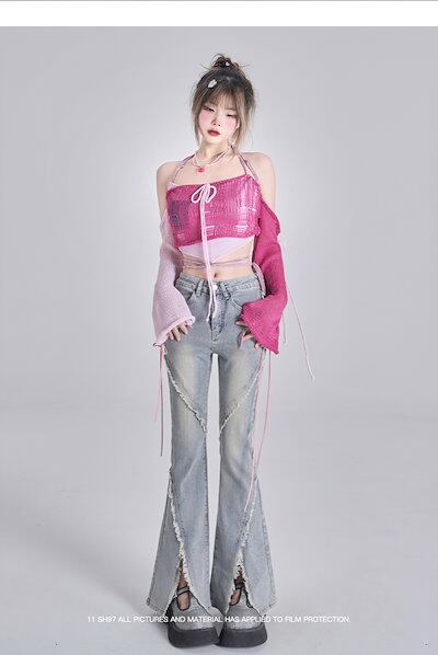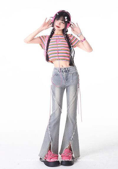 2024夏 韓国 デニムパンツ ボトムス ジーンズ ハイウエスト ファッション系ワイド スタイルサイド紐が付い ゆるダボ ジーンズ シルエット加工 レディース カジュアル メンズライク | HUG-L