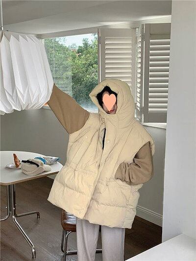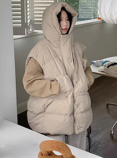 重ね着 帽子付き 羽織り 防寒 カジュアル オシャレ ベージュ ノースリーブ ラウンドネック お洒落 ブラック 暖か レディース ゆったり トップス ベスト 秋冬 中綿ベスト アウター 上着 前開き | HUG-L