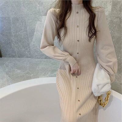 セーター ニット ロングニット あったかい 無地 ニット レディース タイト ニットワンピース 大きいサイズ 冬物 リブニット カットソー インナー 長袖 冬 膝下 秋冬 パフスリーブ ロングワンピー | HUG-L