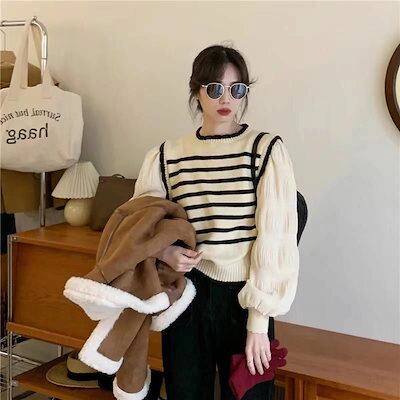 大きいサイズ 長袖 可愛い プルオーバー ニットプルオーバー 秋 ニットソー レディース きれいめ きれいめ 柄 バルーン袖 ゆったり 秋冬 お洒落 セーター 冬 ボーダー トップス プルオーバー ト | HUG-L