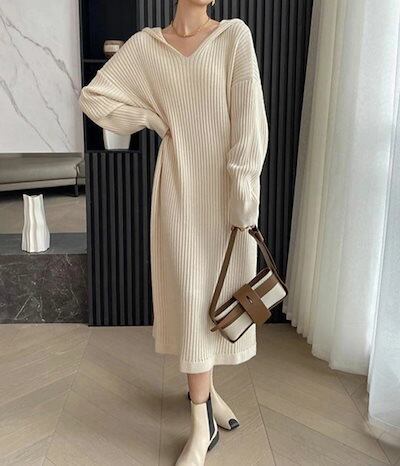 ロングニット セーター ゆったり レディース 大きいサイズ ニットソー マキシ丈トップス 長袖 リブニット あったかい ニットワンピース 秋冬 フード付き カットソー ニットセーター 厚手 ロングワン | HUG-L