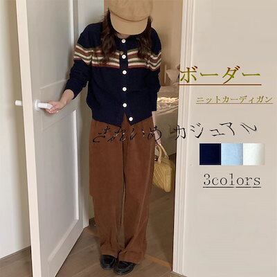カーディガン クルーネック ニットカーディガン 秋 秋冬 柔らかい ニットコート レディース ボーダー ニットセーター ライトアウター ニット 可愛い 長袖 体型カバー アウター コーディガン 大きい | HUG-L