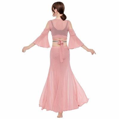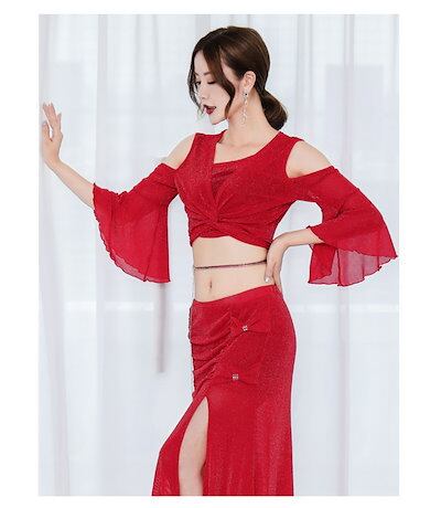 インナーパンツ付き ロングスカート 社交ダンス セットアップ ダンス 衣装 上下セット 衣装 ベリーダンス レッスンウェア レディース 2点セット フレア袖 レッスン着 ラメ入り ステージ衣装 トップ | HUG-L
