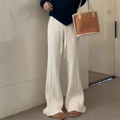 伸縮性 ロングパンツ レディース ハイウエスト ボトムス ワイドパンツ 暖かい 秋 冬 フレア 防風 ニット ワイド リブニット シンプル ストレッチ 防寒 パンツ ウエストゴム ニットパンツ ロング | HUG-L