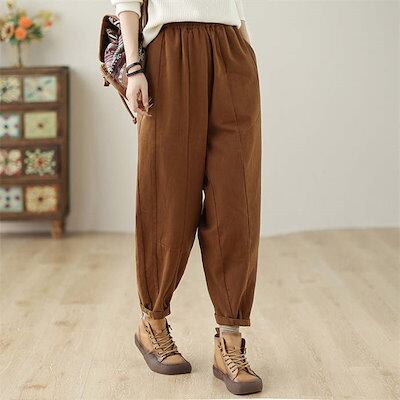ゆったり 秋冬 秋 ロングパンツ 冬 ウエストゴム コットン カジュアル 大きいサイズ 着痩せ ポケット付き ロング丈 ボトムス パンツ サルエルパンツ レディース 綿 ワイドパンツ 美脚 ズボン テ | HUG-L