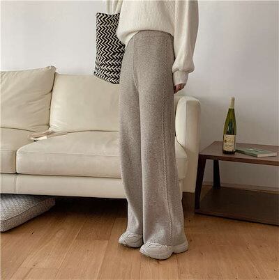 レディース ワイド ガチョウパンツ 通勤 ニットパンツ 美脚 ゆったり リブパンツ カジュアル きれいめ ウエストゴム ボトムス 普段着 快適 リラックスパンツ 暖かい ワイドパンツ きれいめ | HUG-L