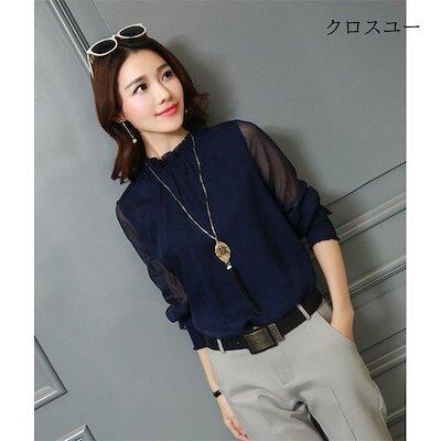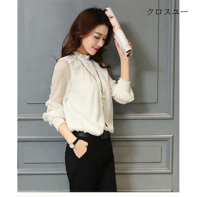 ブラウスレディースおしゃれトップスフリルブラウス立ち襟白シャツ長袖シフォンブラウスオフィス春ブラウスきれいめ着痩せ通勤OL304050