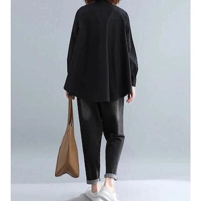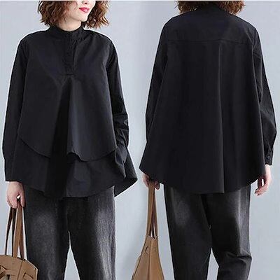 シャツ レディース ブラウス 黒 長袖 立ち襟 フレア 春 秋 長袖 オフィス 通勤 シャツブラウス 無地 Aライン トップス レイヤード風