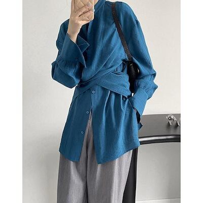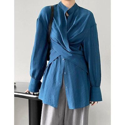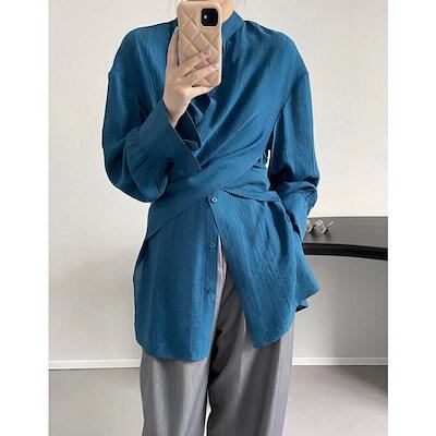 ブラウス 長袖 立襟 チュニック レディース シャツ スキッパー襟 ゆったり 大きいサイズ 体型カバー 春 秋 カジュアル 前クロス デザイン感 おしゃれ