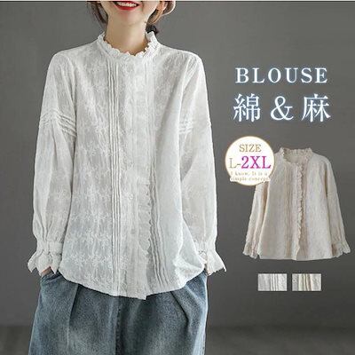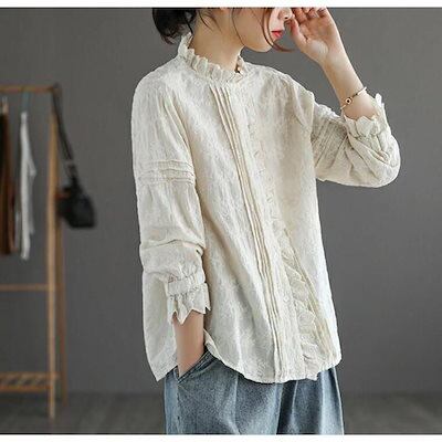 ブラウス 立ち襟 フリル シャツブラウス レディース コットン シャツ 長袖 綿ガーゼ 麻 ナチュラル風 刺 レース 通勤 カジュアル きれいめ ゆったり