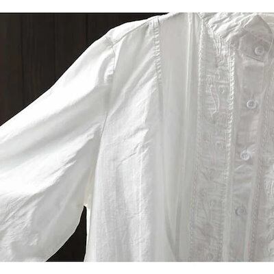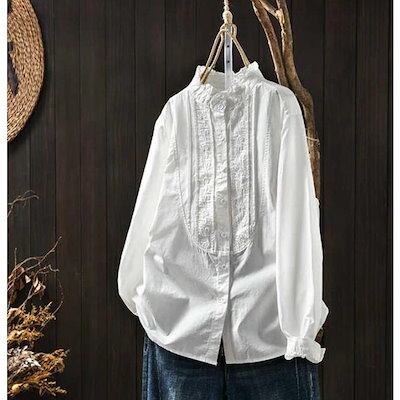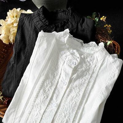 シャシャツ ブラウス レディース 春 夏 秋 長袖 前開き シャツブラウス フリル襟 綿混 レース シャツブラウス コットン スタンドカラー 通勤