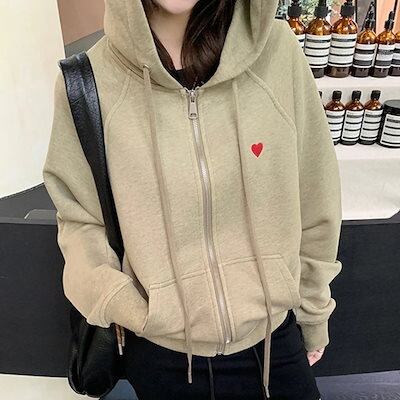 2024秋冬アウターパーカーフード付きジップチャック長袖花柄ポケットハート細見え秋緑カーキおしゃれかわいいガーリーキュート甘め韓国ファッションレディースお出か