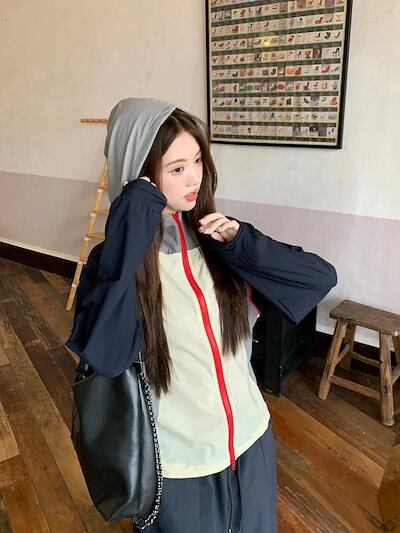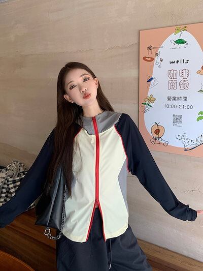 2024秋冬アウターパーカージップチャックフード付きコントラスト秋おしゃれかわいい韓国ファッションレディースお出かけ