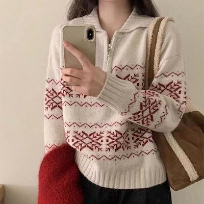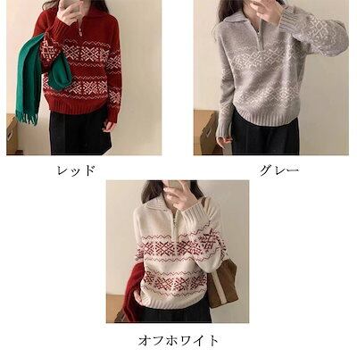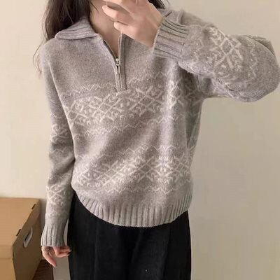 ニットセーターレディース秋冬ニットパーカーハーフジップフレンチスリーブリブニット長袖ゆるめビッグ襟ニットセーターセーラーカラー秋冬柄通勤通学ニットトップス春体型