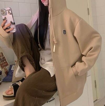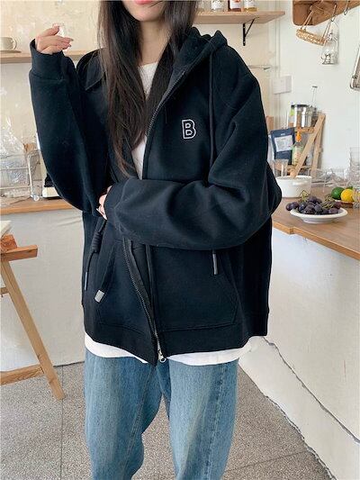 英字 フード付き ジップアップ パーカー ジャケット レディース トップス 部屋着 アウター 羽織 丈長 長袖 ドロップショルダー フード ストリート ファスナー ポケット 前開き ドロスト 裏起毛