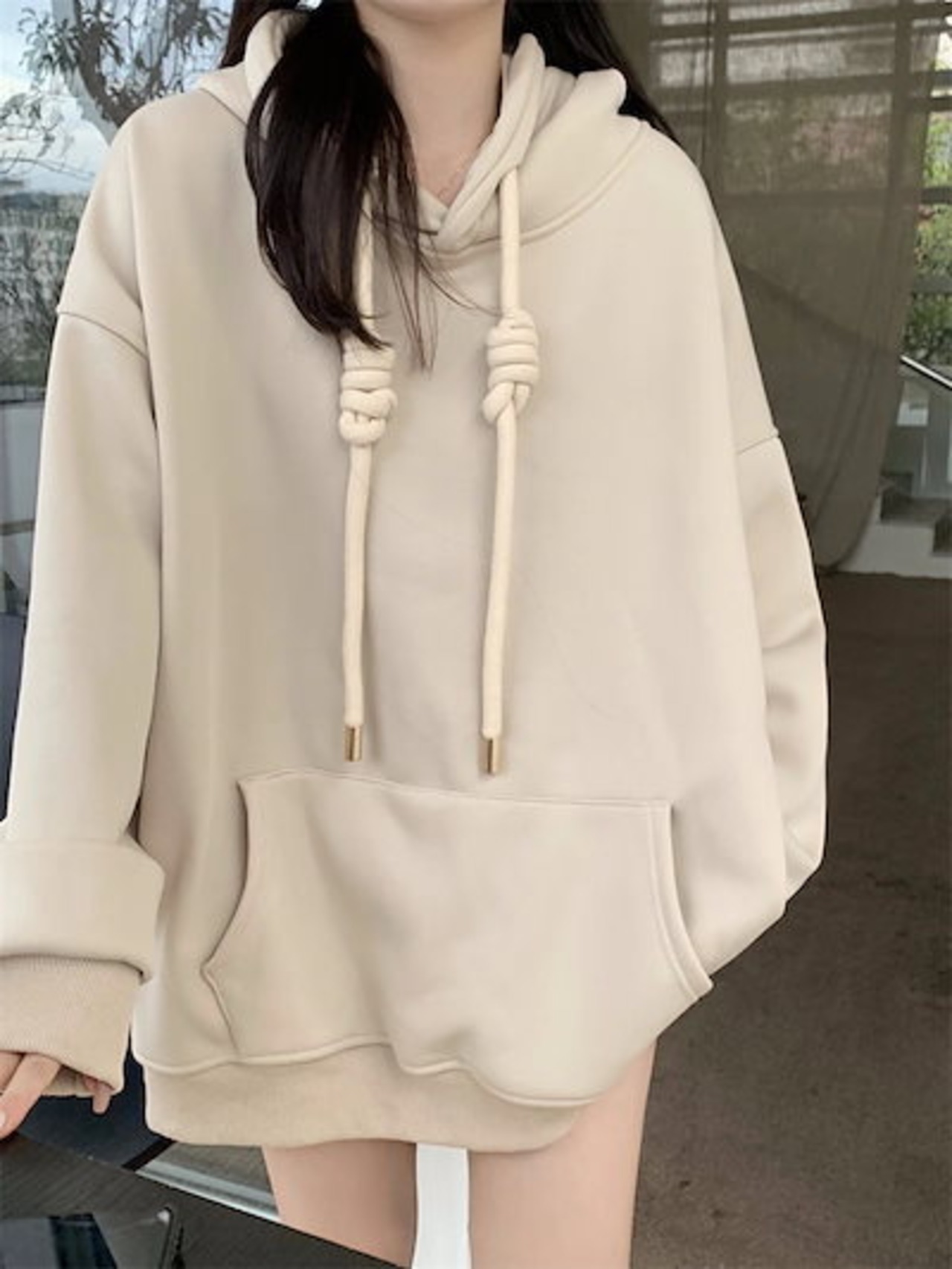 トップス レディース パーカー 2カラー 韓国 フリーサイズ カーキ ベージュ カラバリ 長袖 無地 ポケット プルオーバー フーディー ドロップショルダー オーバーサイズ ビッグシルエット ゆったり | HUG-L