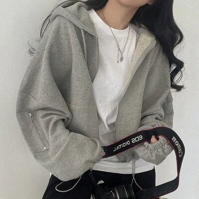 トップス レディース 20代 パーカー スウェット ショート 長袖 ボリューム袖 フード オーバーサイズ ストリート ウエストマーク ファスナー ポケット ハイウエスト 前開き 大人可愛い カジュアル | HUG-L
