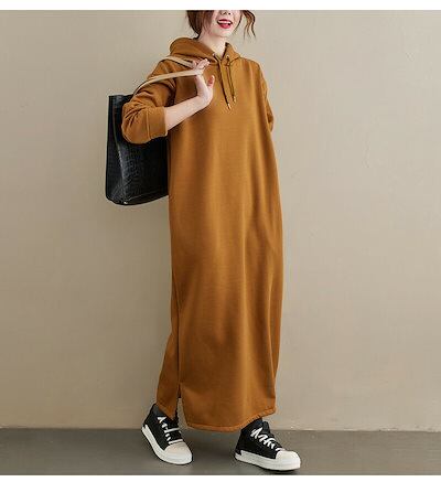ワンピース 裏起毛ワンピース 秋冬物 マキシワンピース パーカーワンピース レディース ゆったり 体型カバー 着やせ 防寒 長袖 マキシ丈 無地 プルオーバー フード付き サイドスリット 大人 カジュ | HUG-L