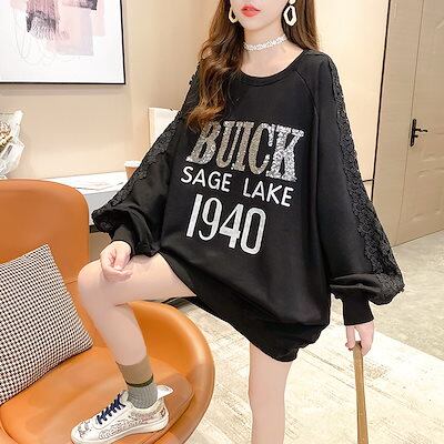 秋スウェット 冬ロンT インナー薄い長袖 tシャツ レディース レーススパンコール韓国ファッション スウェット セミロング 体型カバー 大きいサイズ トップス パーカー レディース 怠惰な風 | HUG-L