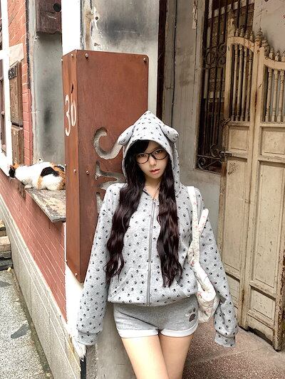 2024 秋冬 韓国 かわいい レディース無地フード付き長袖アウターレトロセット_白フーディーブルサイズ丈トップス春カジュアルスポーツファッション系通学学生袖お出かけアップシルエットトラック上下羽織り | HUG-L