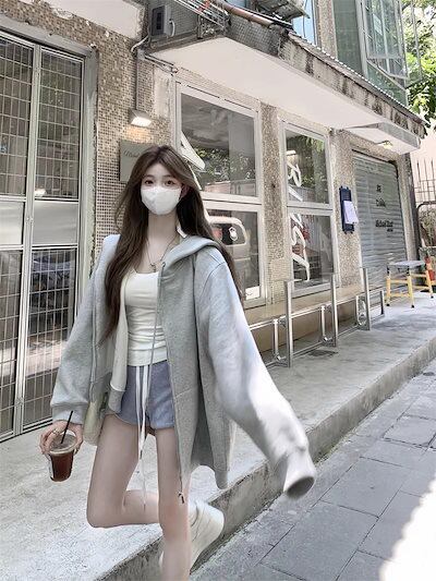 2024 秋冬 韓国 かわいい レディース 無地 フード付き長袖アウターレトロセット_白フーディーブルサイズ丈トップス春カジュアルスポーツファッション系通学学生袖お出かけアップシルエットトラック羽織り | HUG-L