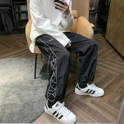 スラックスパンツ / 韓国ファッション/ゆるっとストリート お出かけ パンツ サイドライン レースアップ スポーティー ユニセックス レディース スタイルアップ 色っぽ 女っぽ カジュアル きれいめ | HUG-L