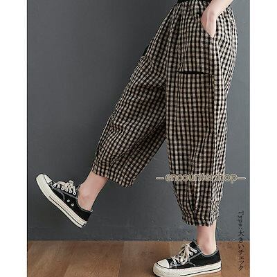 バルーンパンツ レディース 夏 テーパードパンツ チェック柄 ウェストゴム ポケット付き サーカスパンツ 七分丈 コットン パンツ ゆったり カジュアル ボトムス