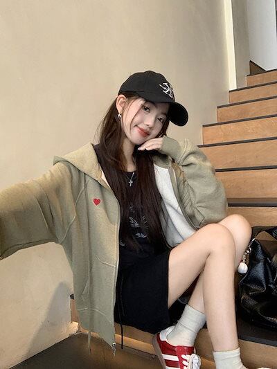 2024 秋冬アウター パーカー フード付き ジップ チャック 長袖 花柄 ポケット ハート 細見え 秋 緑 カーキ おしゃれ かわいい ガーリー キュート 甘め 韓国ファッション レディース お出か