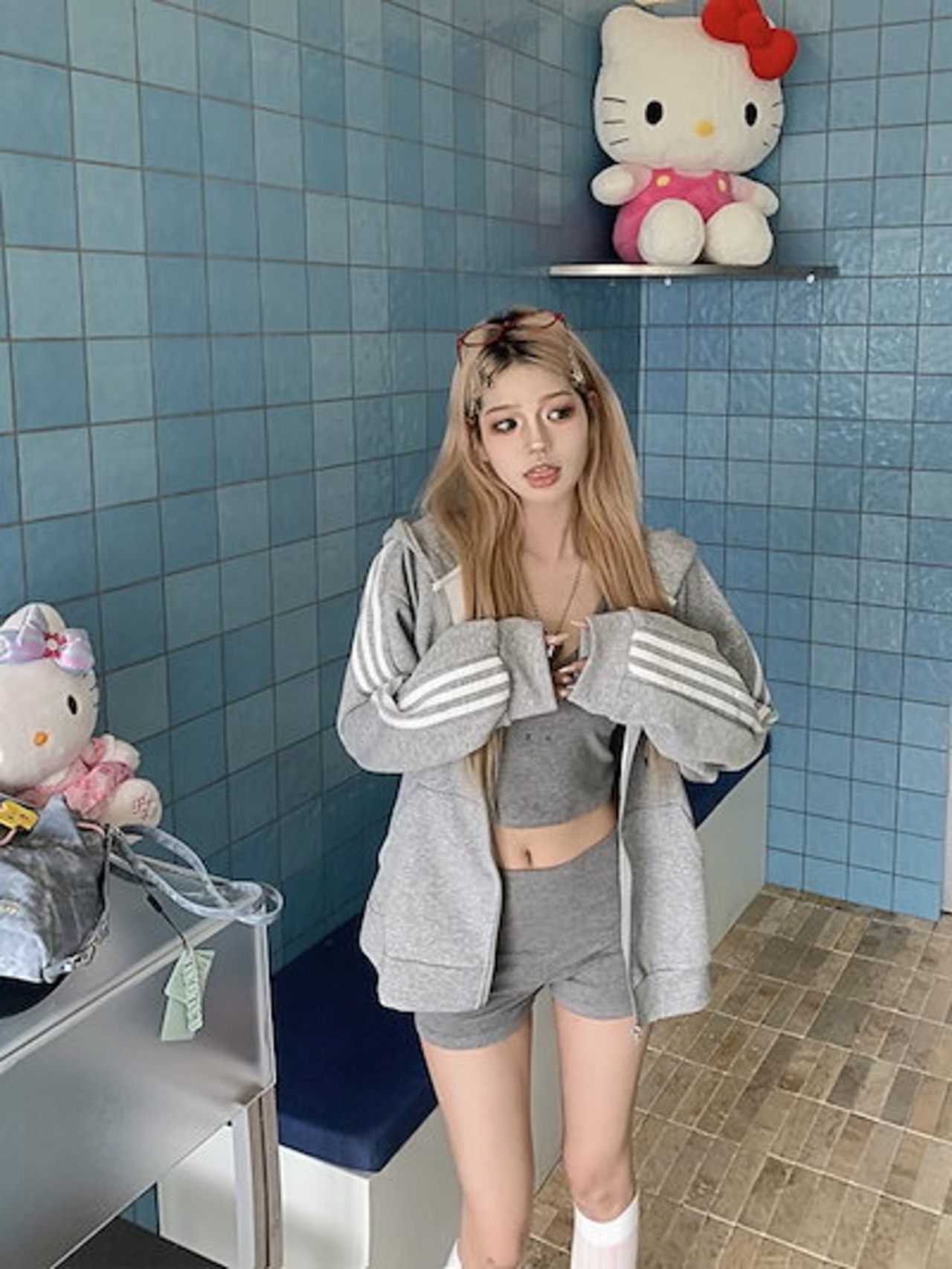 2024 秋冬トップス パーカー フード付き チャック 長袖 ストライプ ゆったり 細見え 白 黒 おしゃれ かわいい ガーリー キュート 甘め 韓国ファッション レディース お出かけフルトラック | HUG-L