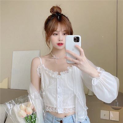 2024 夏 韓国 ショート丈 薄手透かし編み 2点カーディガン トップス長袖紫外線対策 UVカット冷房羽織り加工きれいめライトニット オフィス OLへそ出し フレンチシースルーファッション韓国レディ | HUG-L