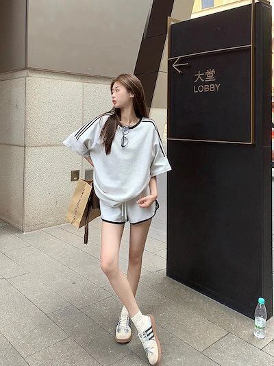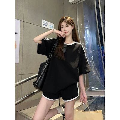2024 夏 韓国 上下2点セット トップス 半袖 お出かけ 羽織り ショート丈ファッション コーデ ミニ丈ボトムス サイド系 ゆったりレディースシルエットワイドサイズお出かけトラック | HUG-L