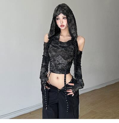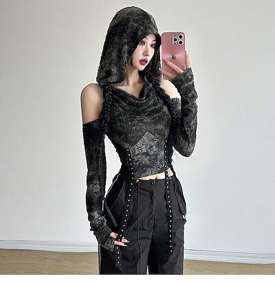2024 春夏トップス Tシャツ 韓国 ラウンドネック 長袖フード付き 着痩せ ショート スリム おしゃれ カジュアル風コーデ丈 ファッション系レディース 加工お出かけ T