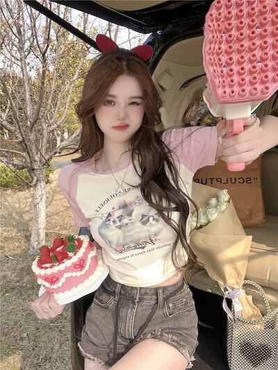 2024 夏 韓国トップス プリント半袖 Tシャツ 韓国 ラウンドネック スリム かわいいへそ出し ショート おしゃれスリーブ カジュアルセットアップコーデ丈 ファッションレディース フレンチお出かけ | HUG-L
