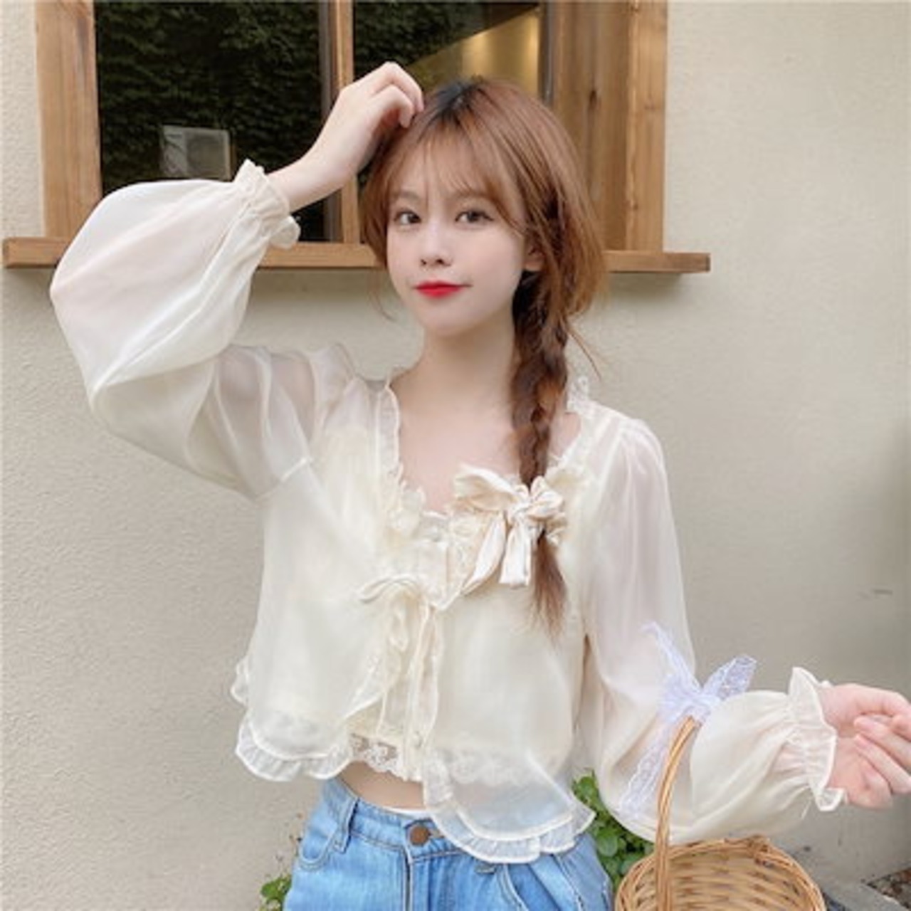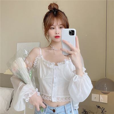 2024 春夏 ショート丈 薄手透かし編み 2点カーディガン トップス長袖紫外線対策 UVカット冷房羽織り加工きれいめライトニット オフィス OLへそ出し フレンチシースルーファッション韓国レディース | HUG-L