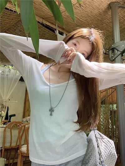 2024 春夏 女度を格上げ tシャツ ファッション トップス ショート丈サイズ 韓国 長袖T薄手 フィット ネックプリント レイヤードT重ね着 肌見せ 女っぽハイフレンチタイトシルエットレディース | HUG-L
