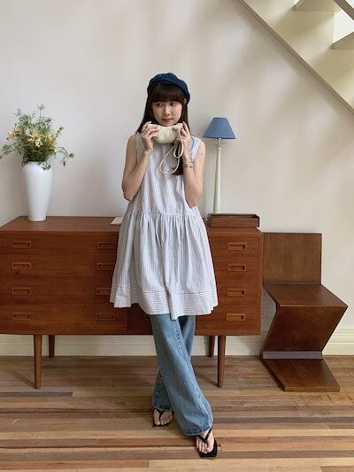 2024 夏 韓国ワンピース ミニ丈 Aライン ストライプ ラウンドネック ノースリーブ ハイウエスト 美脚効果 脚長効果 細見え 夏 おしゃれ かわいい キュート ガーリー 韓国ファッション レディ | HUG-L
