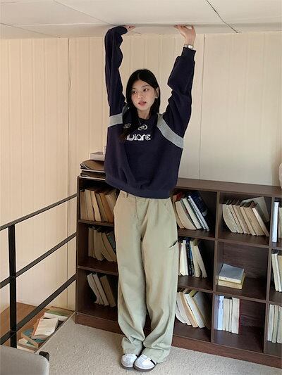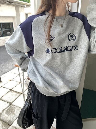 2024 秋冬 トレンド薄手トップスラウンドネックバイカラー長袖かわいいK-POPTロング_白レディース韓国風ロゴ衣装ルーズゆったりプリントおしゃれサイズスリーブシルエットファッション系サイドシャツ