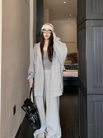 2024 秋冬 韓国 3点セット かわいい レディース フード付きアウター_白フーディー ブルゾン長袖ショート丈トップスグレー冬カジュアルファッション系お出かけフル丈トラック高校生 通学大学生
