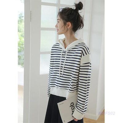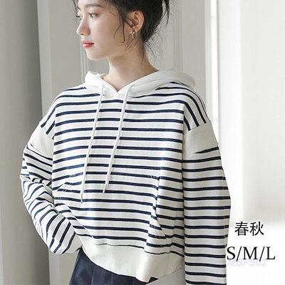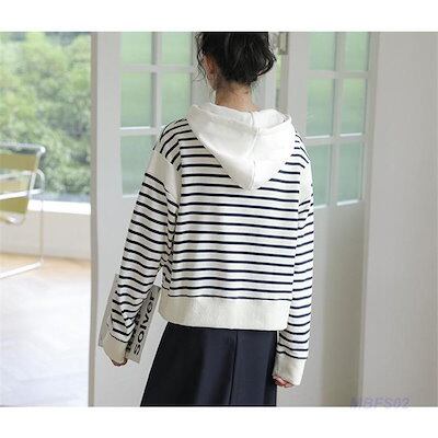 パーカー レディース 長袖パーカー フード付き トップス プルオーバー ストライプ柄 カジュアル シンプル ゆったり 秋服 カーデ イベント トレンド