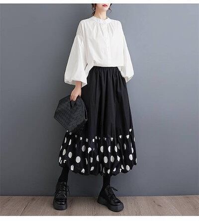 スカート ドット バルーンスカート レディース 秋 水玉柄 ロングスカート 切替 ボトムス ミモレ丈 きれいめ フレア ウエストゴム 春 秋 冬 ロングスカート フェミニン カジュアル 大人 可愛い | HUG-L